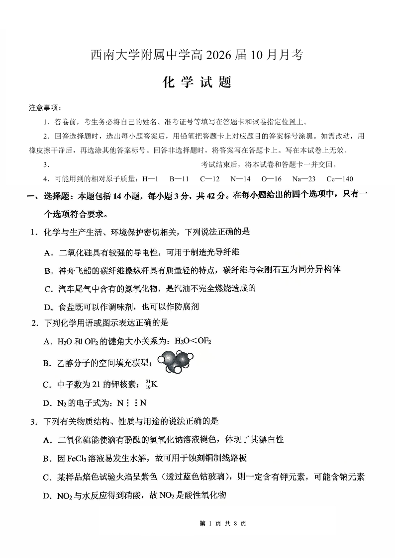 西南大学附属中学高2026届高三10月月考 化学.pdf