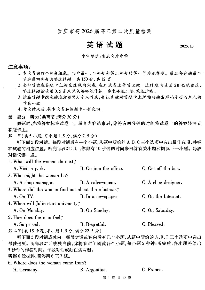 南开中学高2026届高三第二次质量检测 英语.pdf