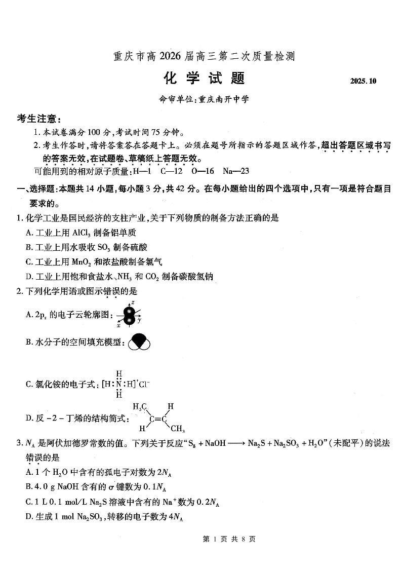 南开中学高2026届高三第二次质量检测 化学.pdf