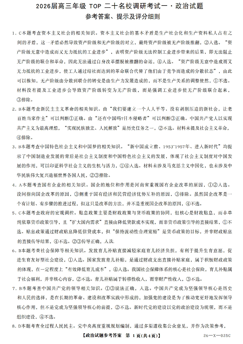 河南省2026届高三年级TOP二十名校调研考试一 政治答案.pdf
