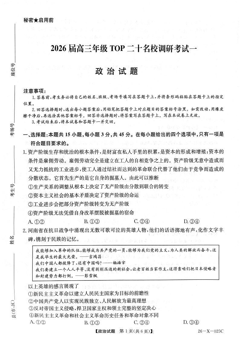河南省2026届高三年级TOP二十名校调研考试一 政治.pdf