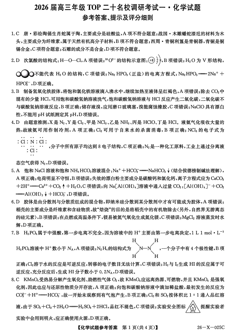 河南省2026届高三年级TOP二十名校调研考试一 化学答案.pdf