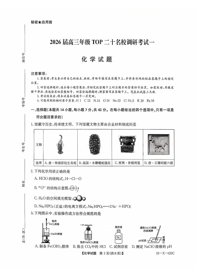 河南省2026届高三年级TOP二十名校调研考试一 化学.pdf