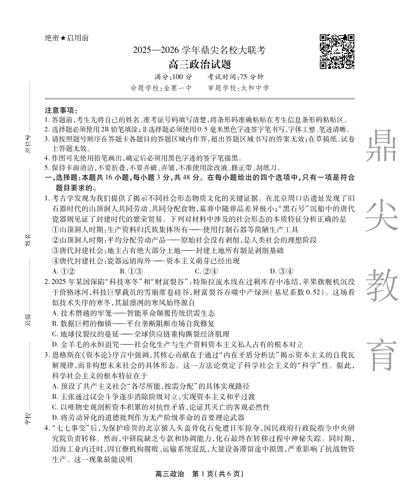 2025-2026学年鼎尖名校大联考 政治.pdf
