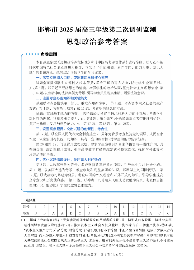 河北省邯郸市2025届高三年级第二次调研监测 政治答案.pdf
