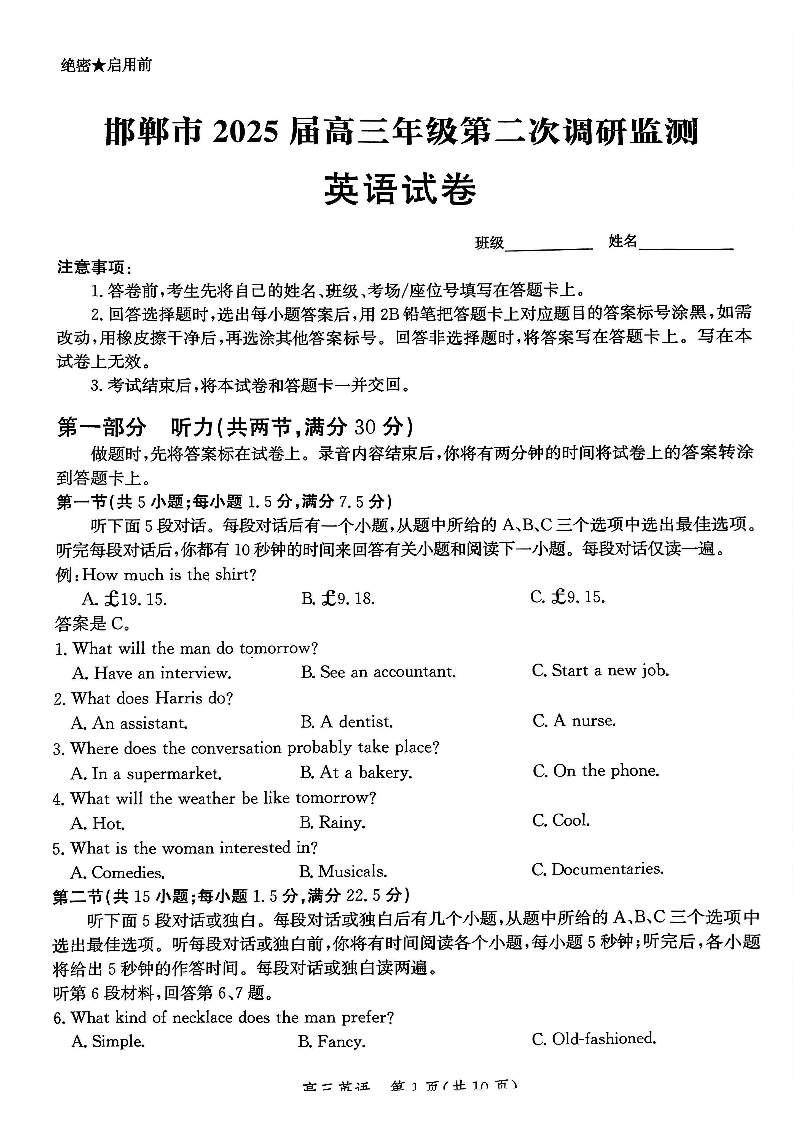 河北省邯郸市2025届高三年级第二次调研监测 英语.pdf