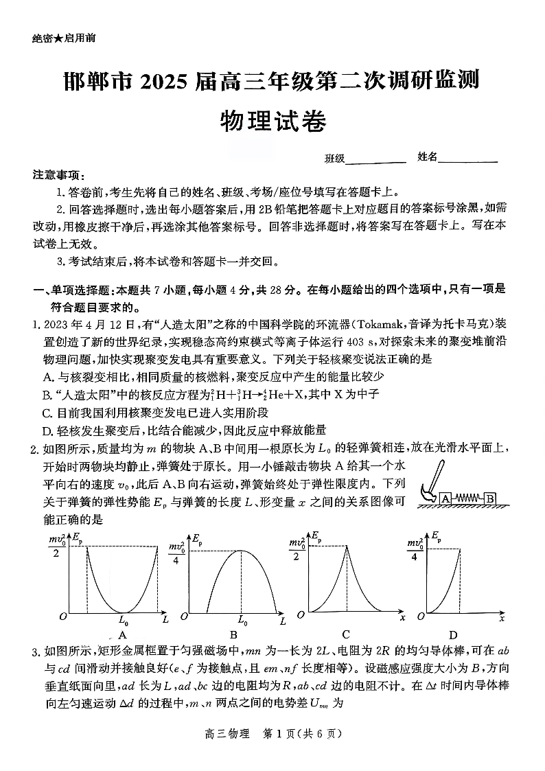 河北省邯郸市2025届高三年级第二次调研监测 物理.pdf