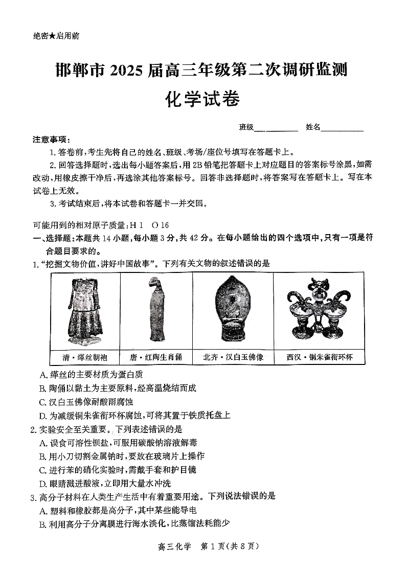 河北省邯郸市2025届高三年级第二次调研监测 化学.pdf