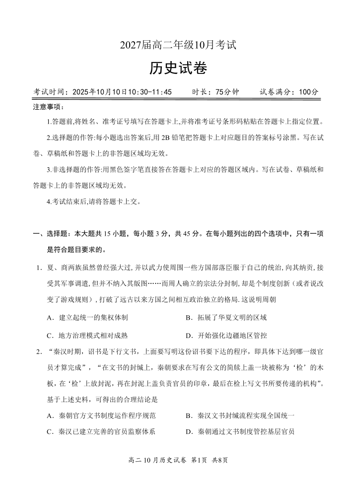 湖北省云学联盟2027届高二年级10月考试 历史.pdf