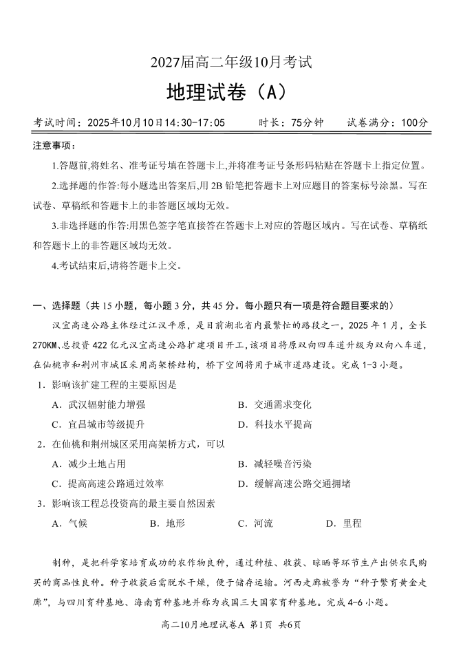 湖北省云学联盟2027届高二年级10月考试 地理(A).pdf