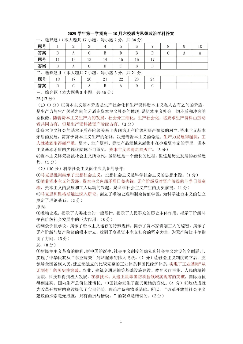 2025学年第一学期高一年级10月六校联考 政治答案.pdf