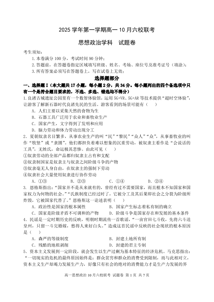 2025学年第一学期高一年级10月六校联考 政治.pdf
