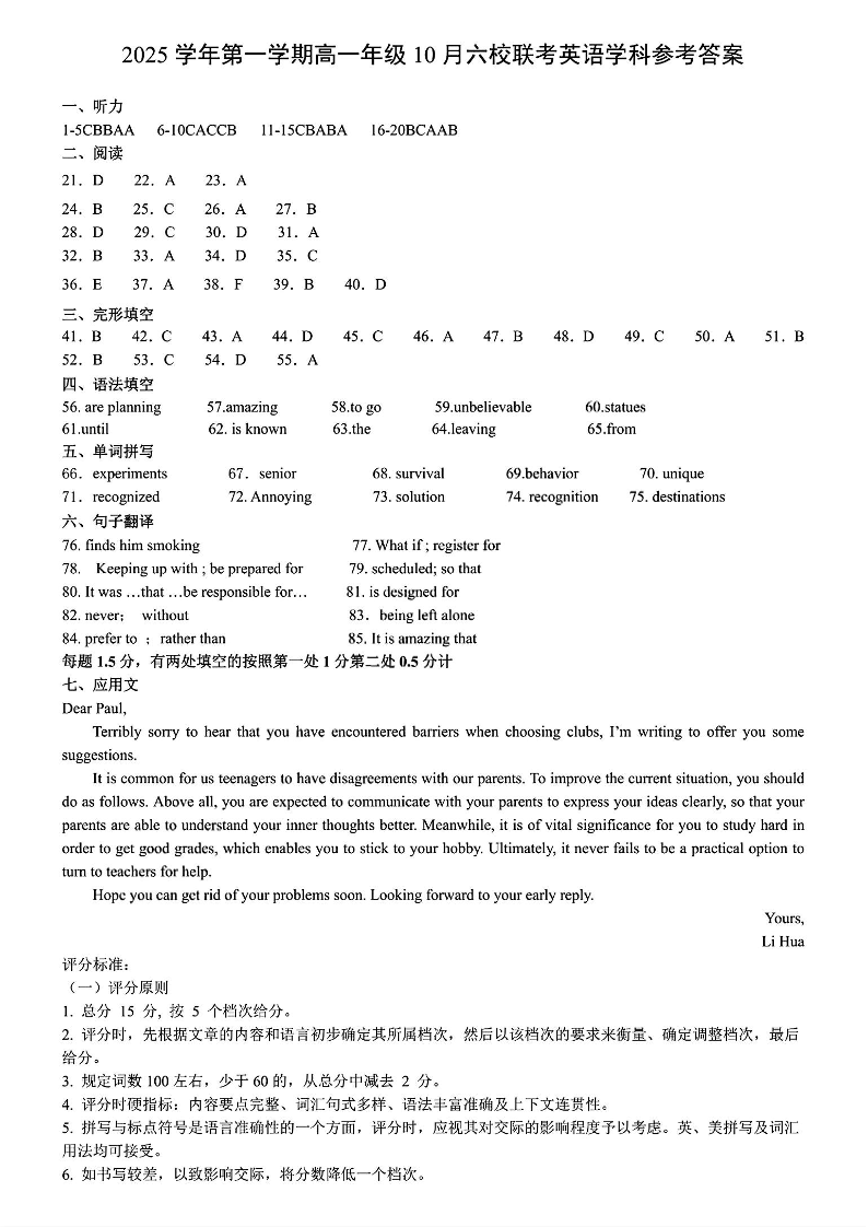 2025学年第一学期高一年级10月六校联考 英语答案.pdf