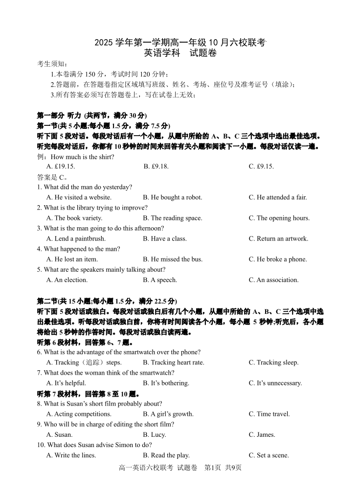 2025学年第一学期高一年级10月六校联考 英语.pdf