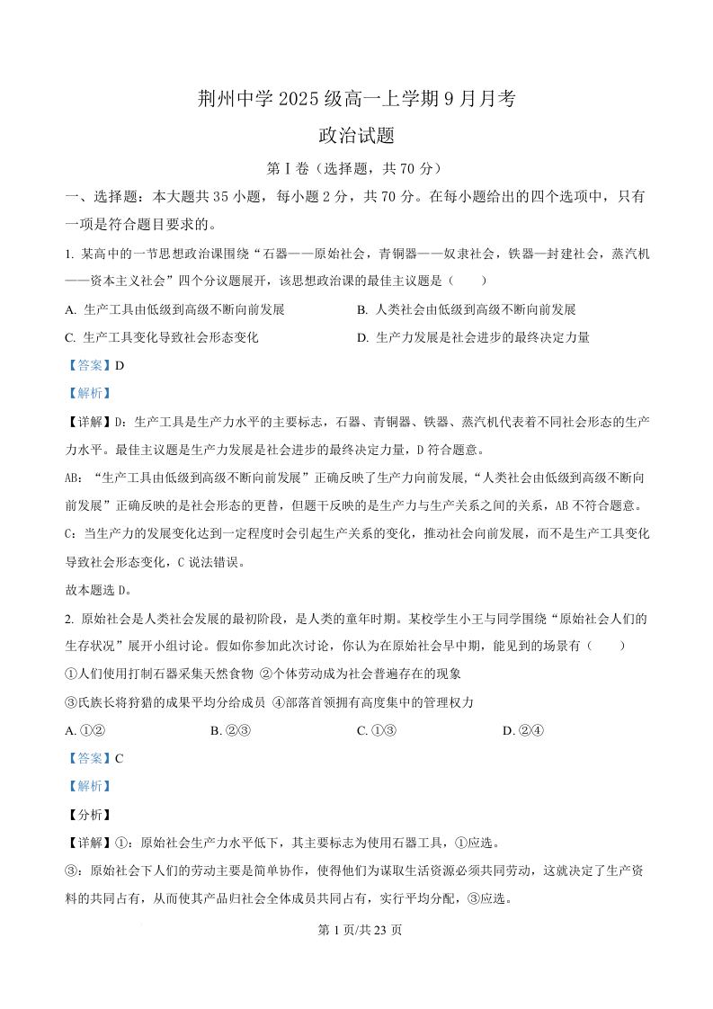 湖北省荆州中学2025-2026学年高一上学期9月月考 政治答案.docx