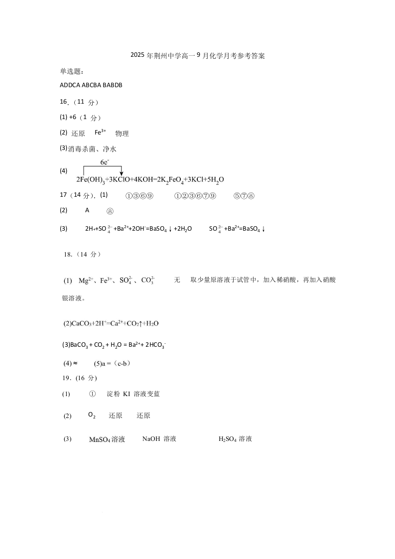 湖北省荆州中学2025-2026学年高一上学期9月月考 化学答案.docx