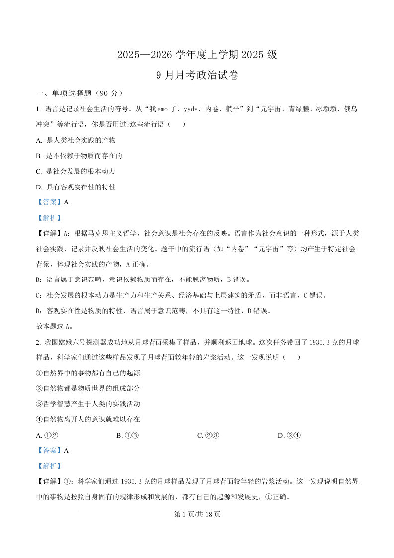 湖北省荆州市沙市中学2025-2026学年高一上学期9月月考 政治答案.docx