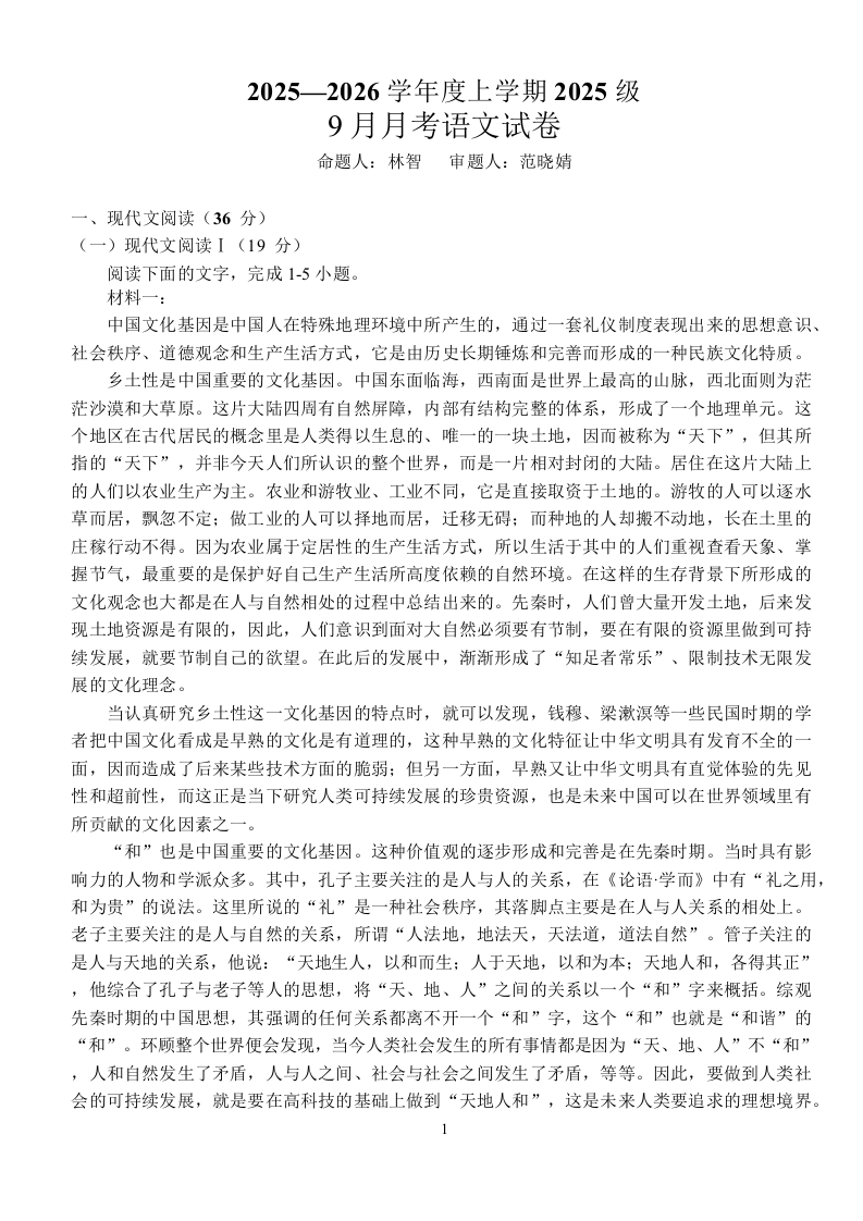 湖北省荆州市沙市中学2025-2026学年高一上学期9月月考 语文(含答案).docx