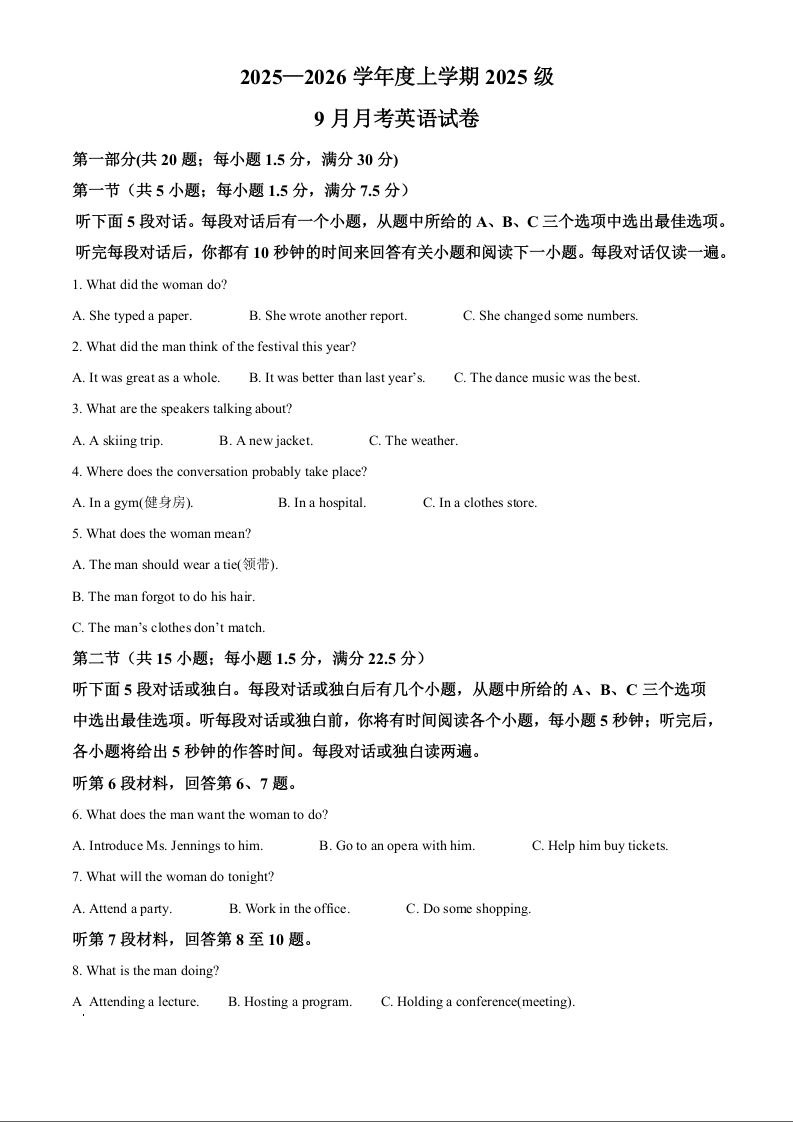 湖北省荆州市沙市中学2025-2026学年高一上学期9月月考 英语答案.docx
