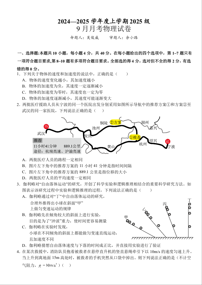 湖北省荆州市沙市中学2025-2026学年高一上学期9月月考 物理.docx