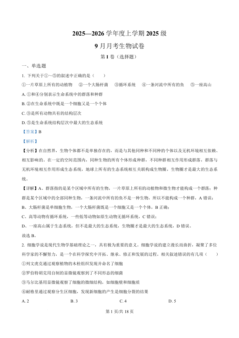 湖北省荆州市沙市中学2025-2026学年高一上学期9月月考 生物答案.docx