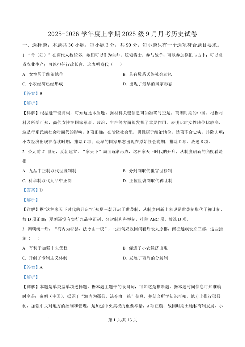 湖北省荆州市沙市中学2025-2026学年高一上学期9月月考 历史答案.docx