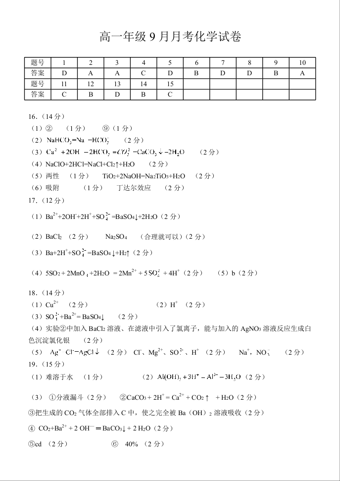 湖北省荆州市沙市中学2025-2026学年高一上学期9月月考 化学答案.docx