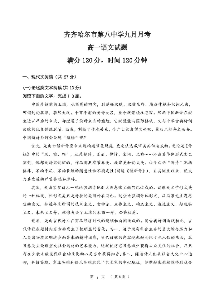黑龙江省齐齐哈尔市第八中学校2025-2026学年高一上学期9月月考 语文.pdf