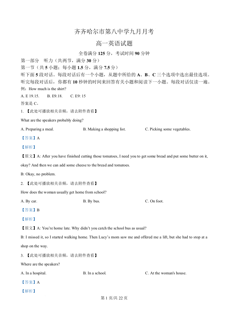 黑龙江省齐齐哈尔市第八中学校2025-2026学年高一上学期9月月考 英语答案.docx