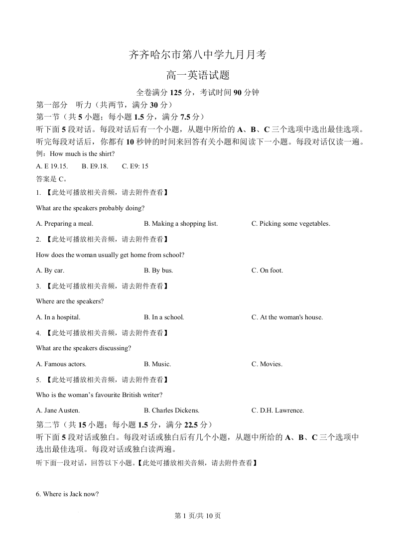 黑龙江省齐齐哈尔市第八中学校2025-2026学年高一上学期9月月考 英语.docx