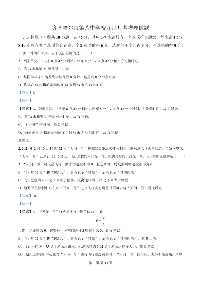 黑龙江省齐齐哈尔市第八中学校2025-2026学年高一上学期9月月考 物理答案.docx