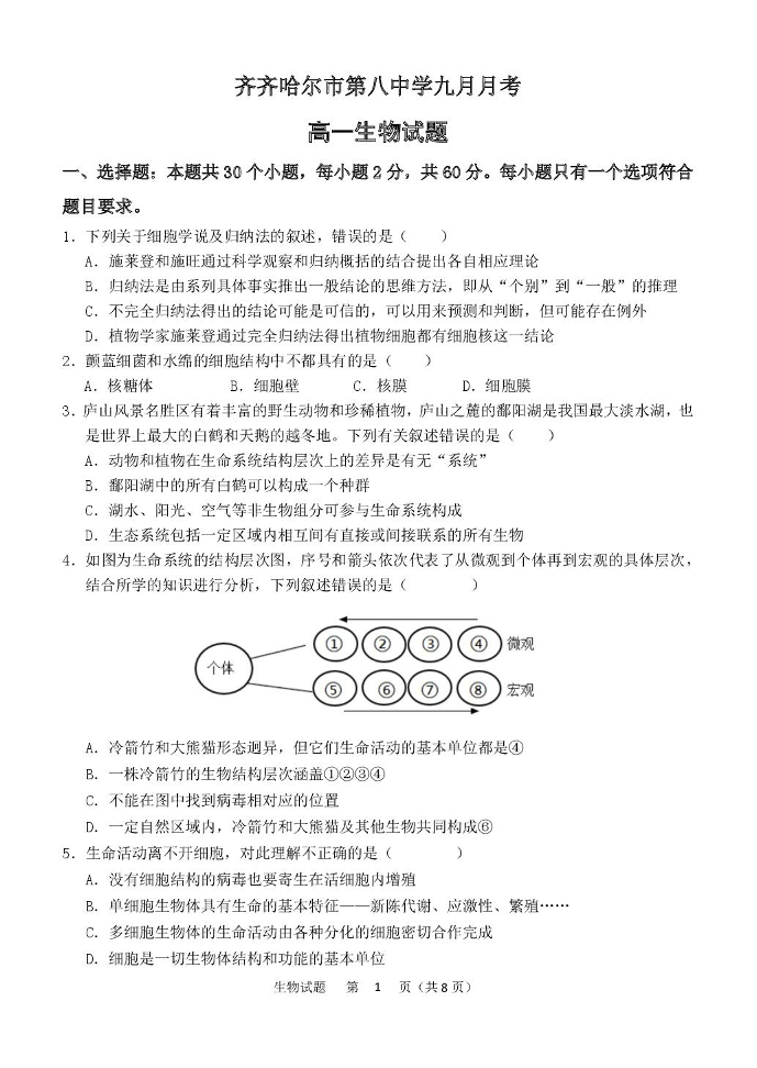 黑龙江省齐齐哈尔市第八中学校2025-2026学年高一上学期9月月考 生物.pdf