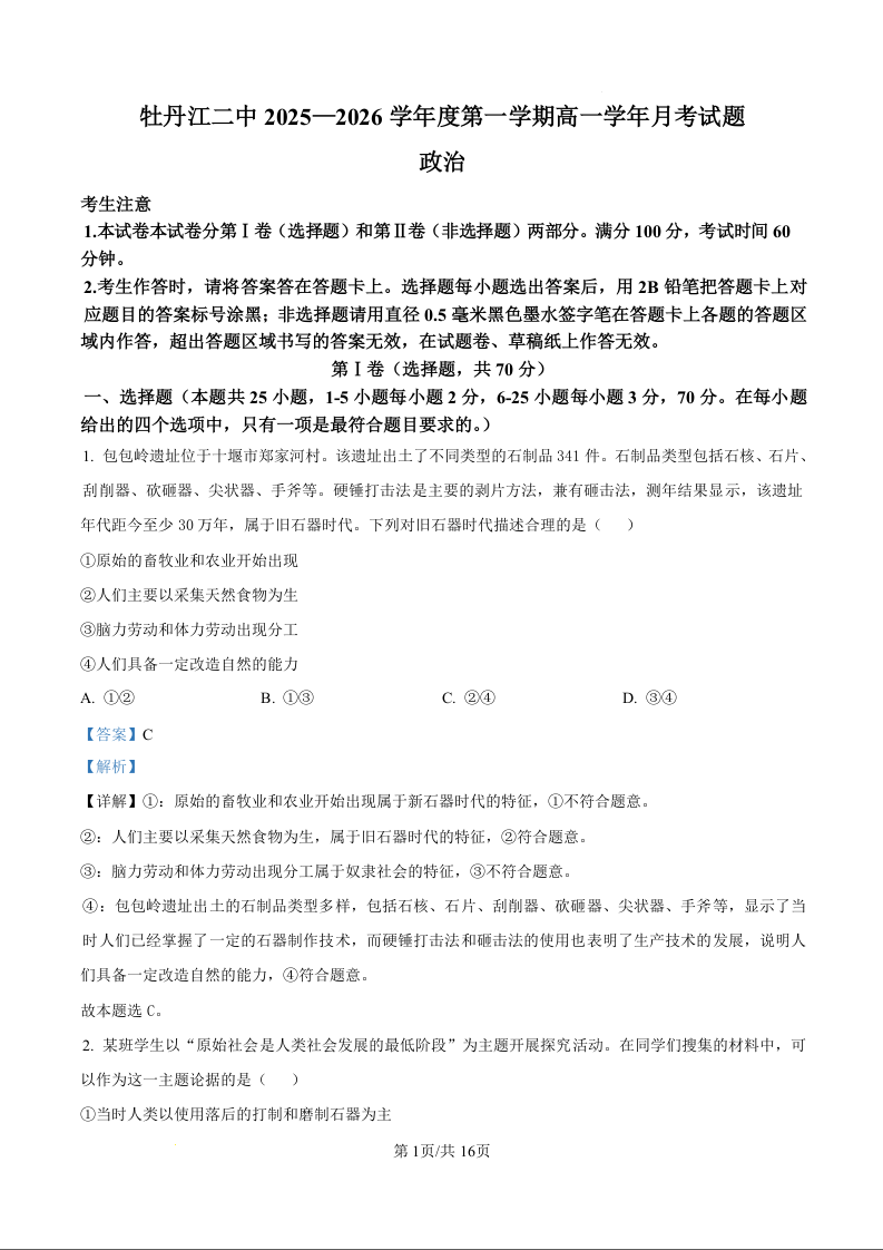 黑龙江省牡丹江市第二高级中学2025-2026学年高一上学期9月月考 政治答案.docx