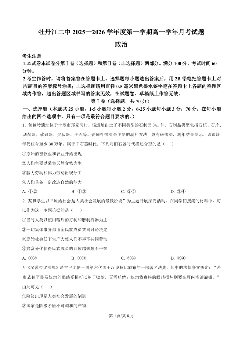 黑龙江省牡丹江市第二高级中学2025-2026学年高一上学期9月月考 政治.docx