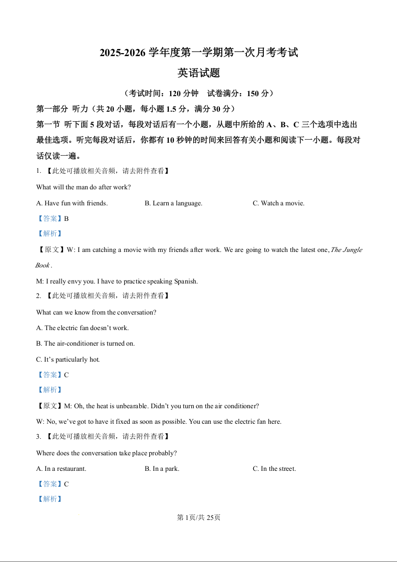 黑龙江省牡丹江市第二高级中学2025-2026学年高一上学期9月月考 英语答案.docx