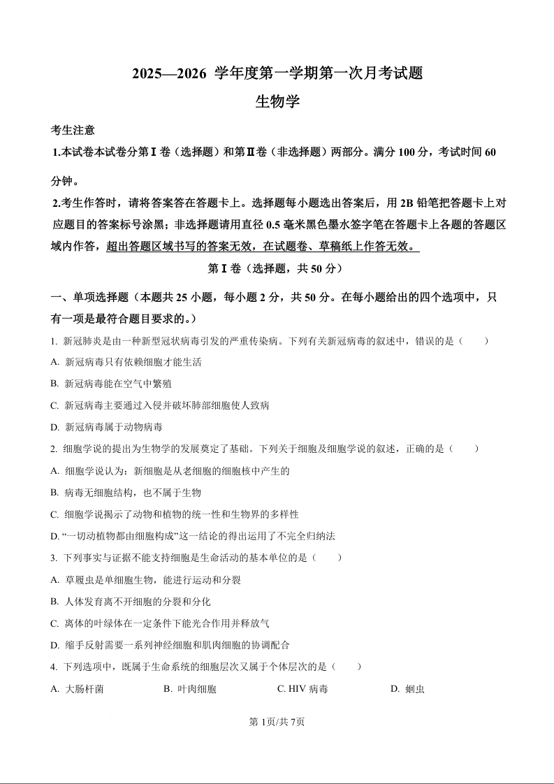 黑龙江省牡丹江市第二高级中学2025-2026学年高一上学期9月月考 生物.docx