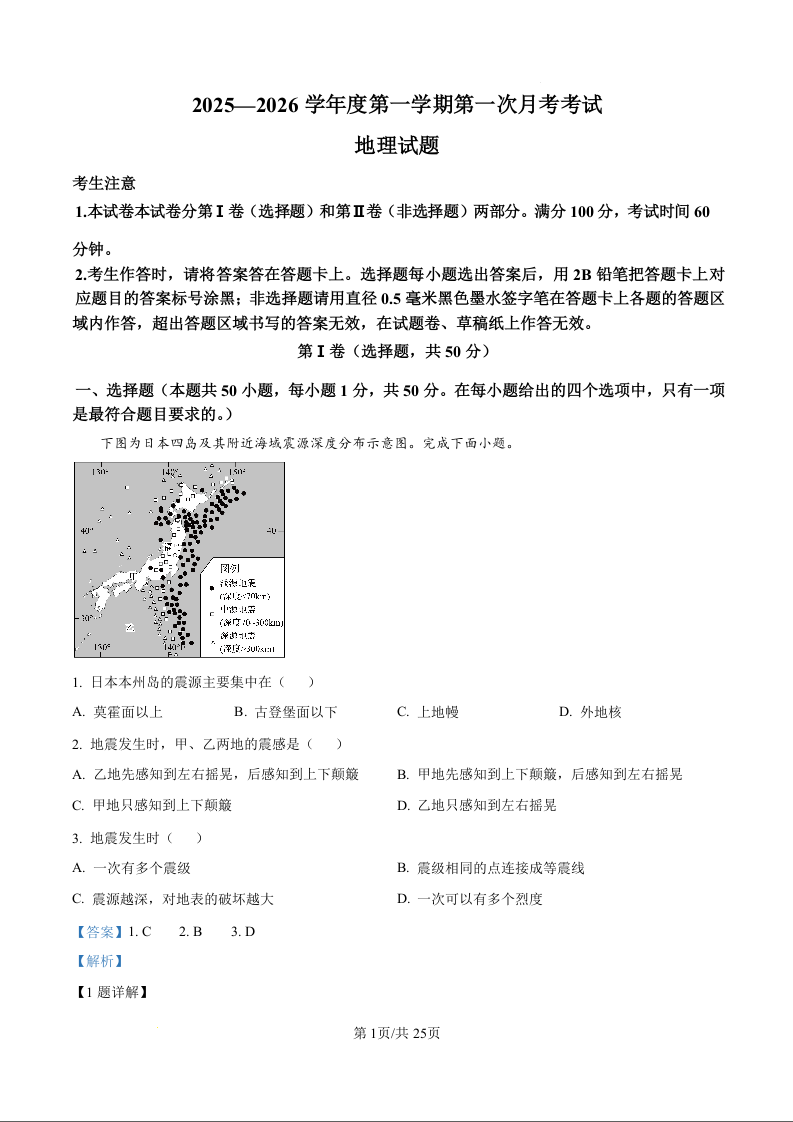 黑龙江省牡丹江市第二高级中学2025-2026学年高一上学期9月月考 地理答案.docx