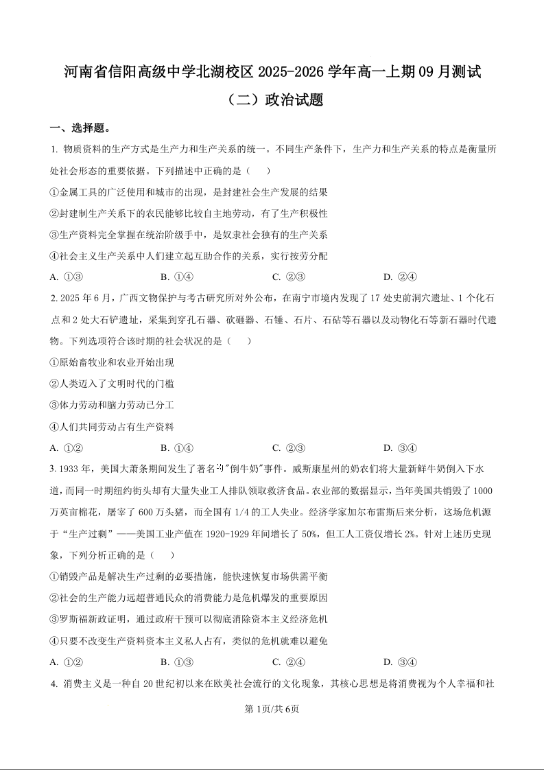 河南省信阳市信阳高级中学2025-2026学年高一上学期9月测试(二)政治.docx