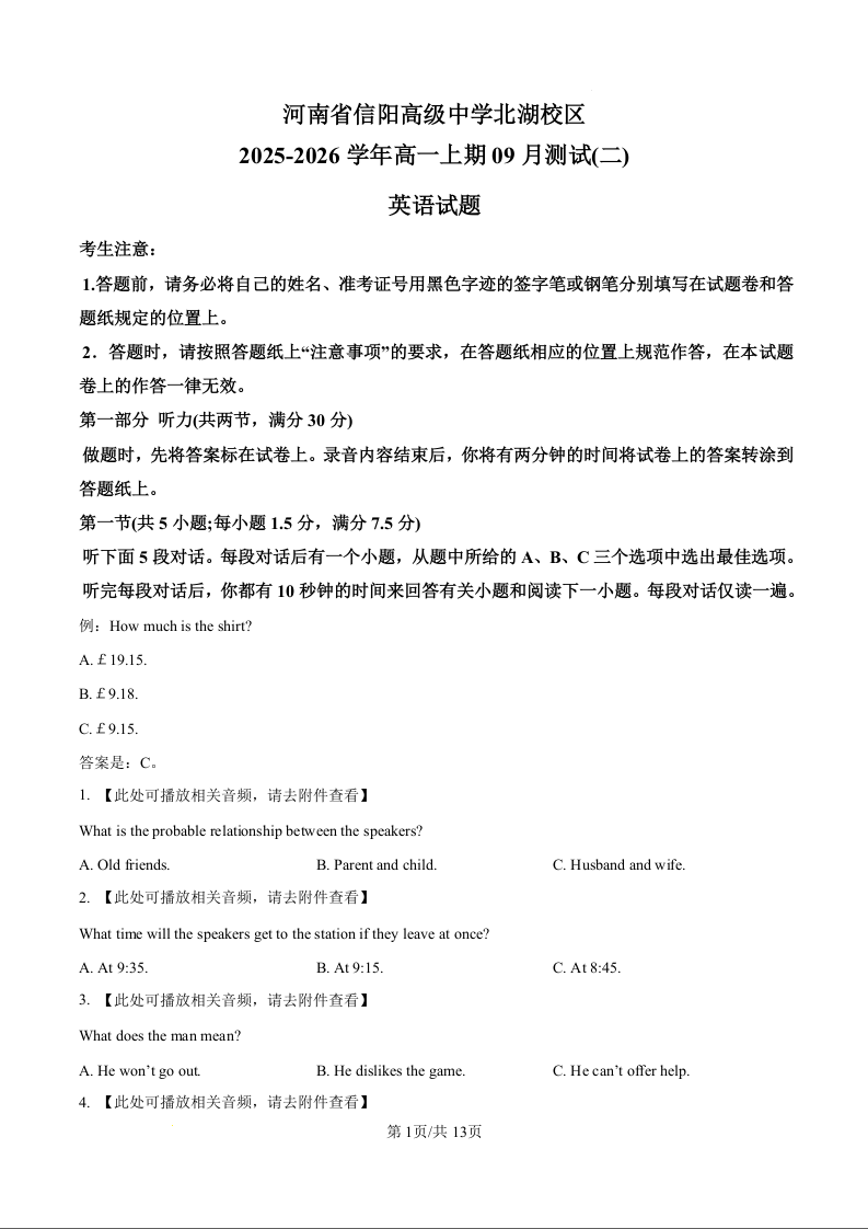 河南省信阳市信阳高级中学2025-2026学年高一上学期9月测试(二)英语.docx