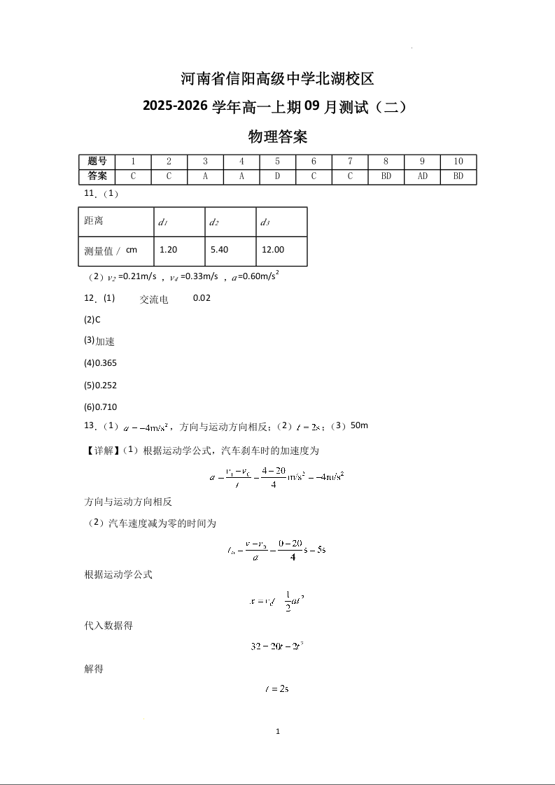 河南省信阳市信阳高级中学2025-2026学年高一上学期9月测试(二)物理答案.docx