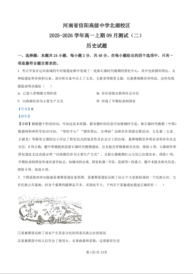 河南省信阳市信阳高级中学2025-2026学年高一上学期9月测试(二)历史答案.docx