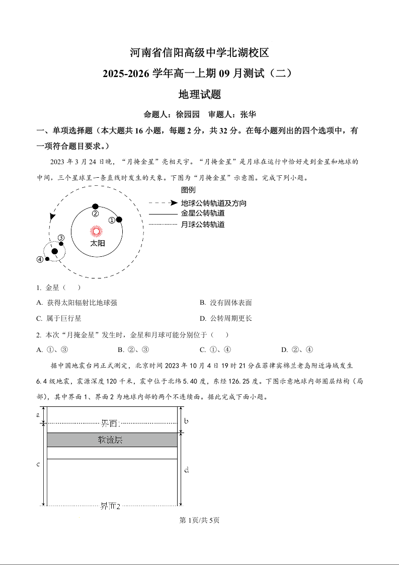 河南省信阳市信阳高级中学2025-2026学年高一上学期9月测试(二)地理.docx