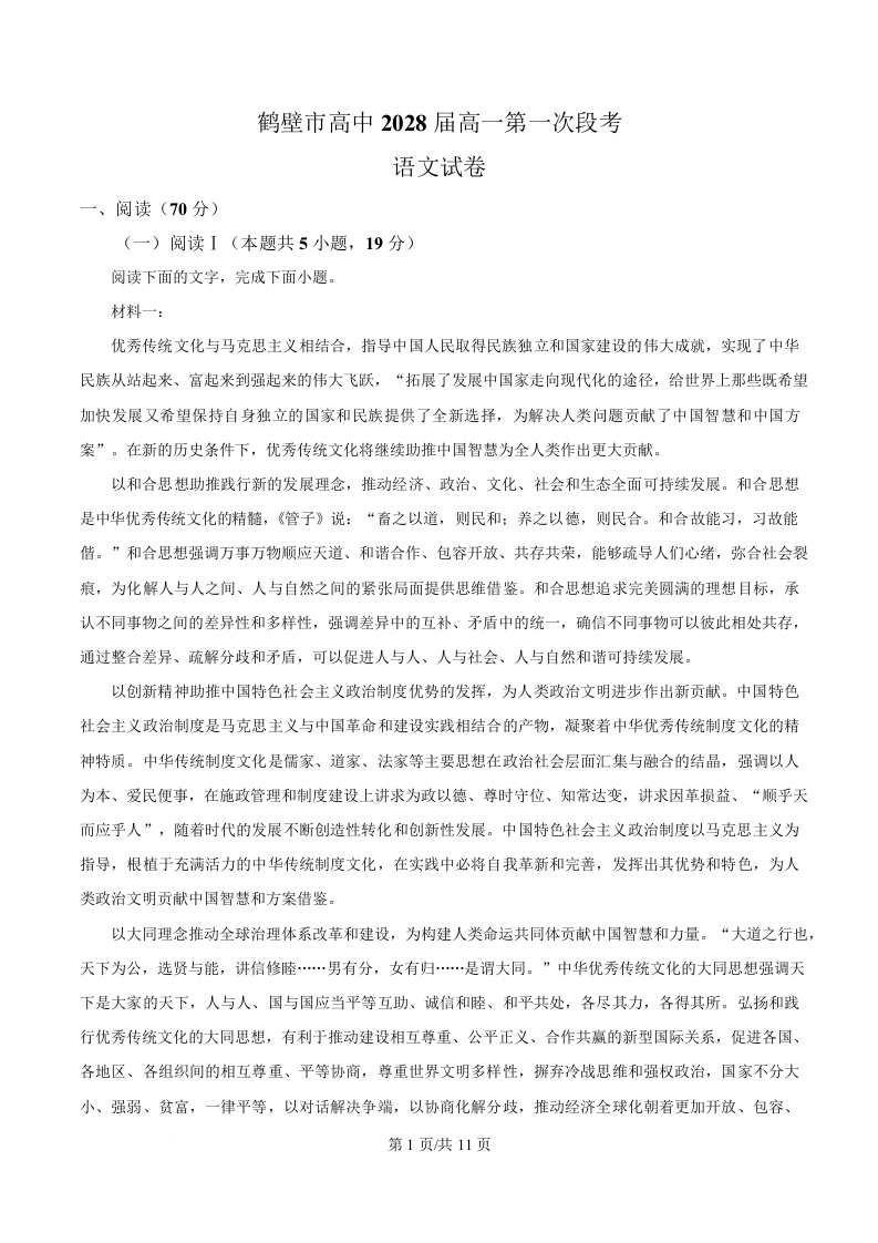 河南省鹤壁市高中2025-2026学年高一上学期第一次段考 语文.docx