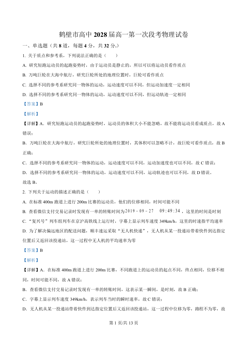 河南省鹤壁市高中2025-2026学年高一上学期第一次段考 物理答案.docx