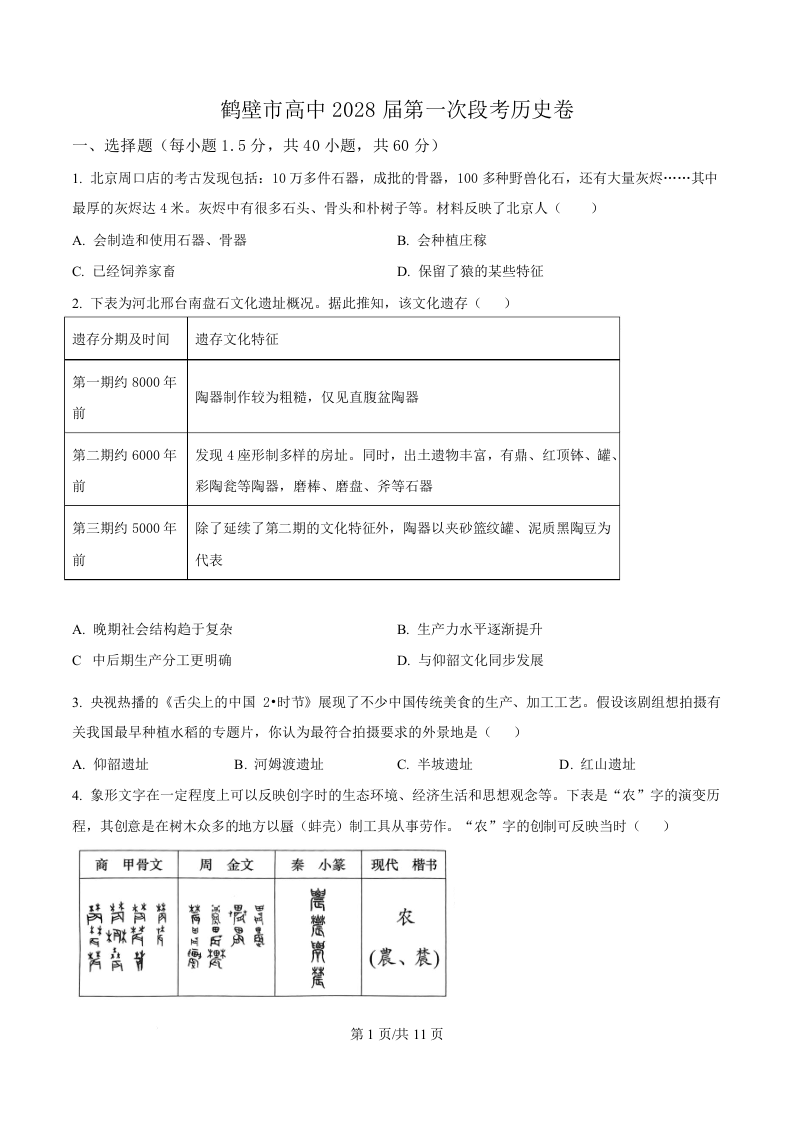 河南省鹤壁市高中2025-2026学年高一上学期第一次段考 历史.docx