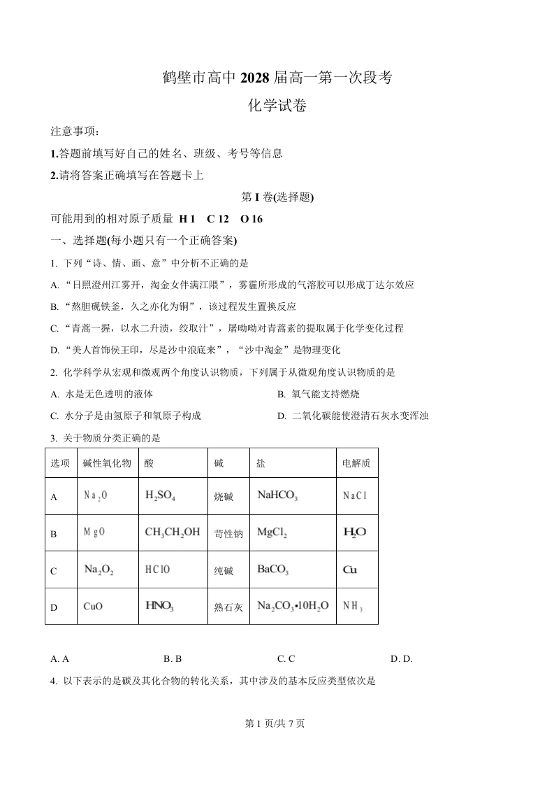 河南省鹤壁市高中2025-2026学年高一上学期第一次段考 化学.docx