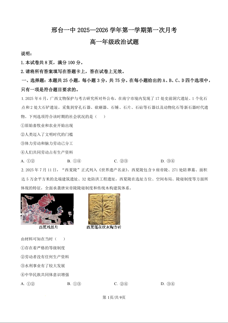 河北省邢台市第一中学2025-2026学年高一上学期9月月考 政治.docx