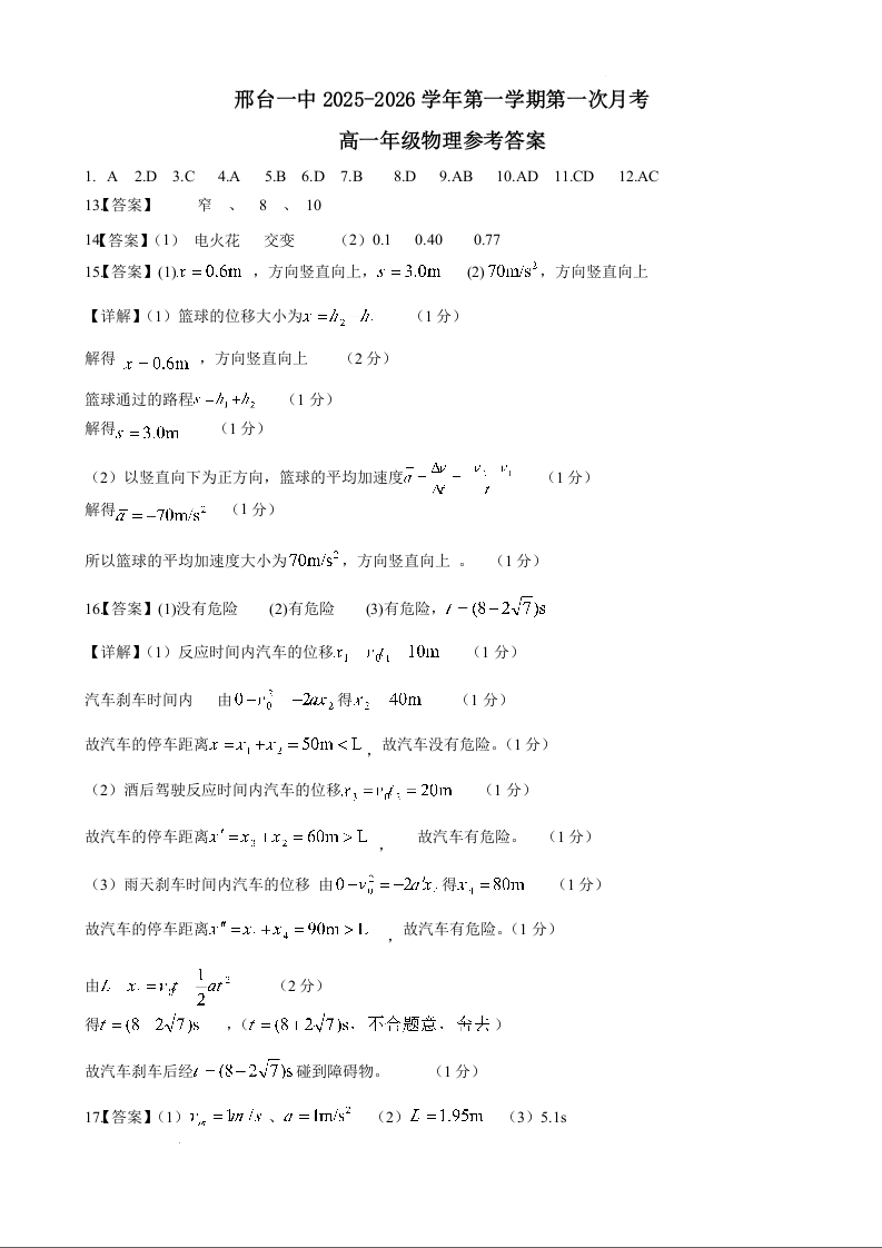 河北省邢台市第一中学2025-2026学年高一上学期9月月考 物理答案.docx