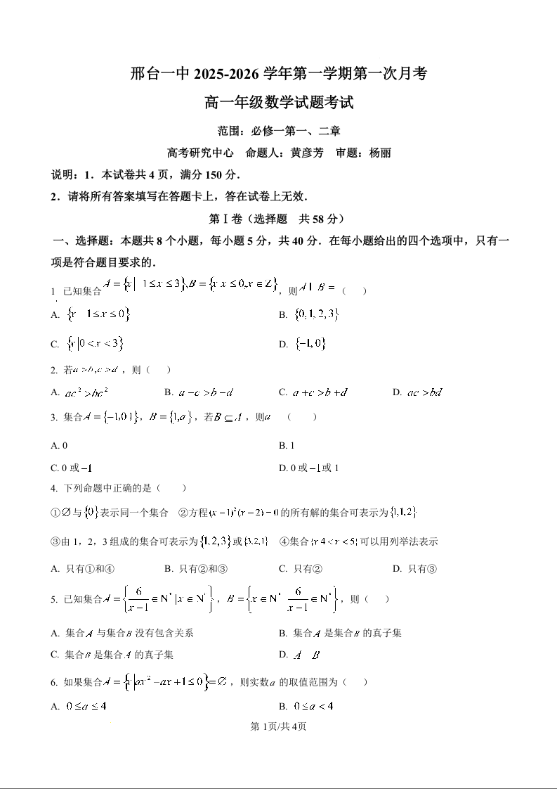河北省邢台市第一中学2025-2026学年高一上学期9月月考 数学.docx