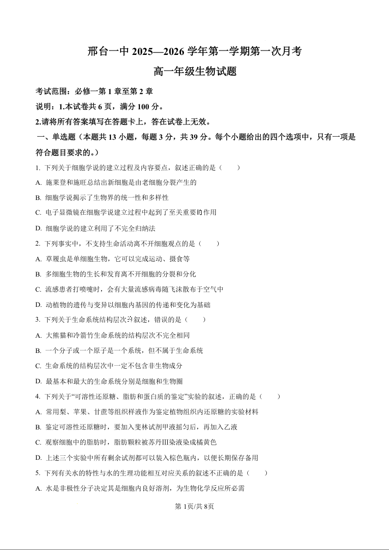 河北省邢台市第一中学2025-2026学年高一上学期9月月考 生物.docx